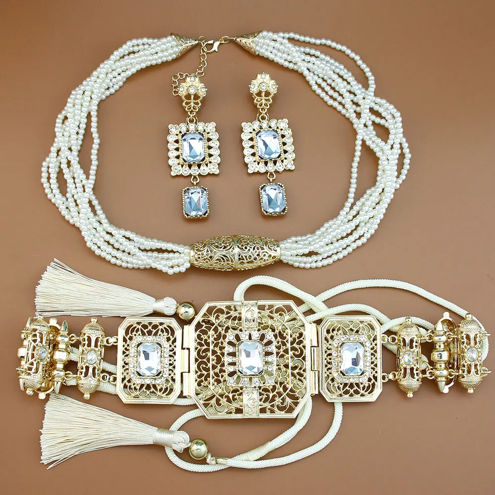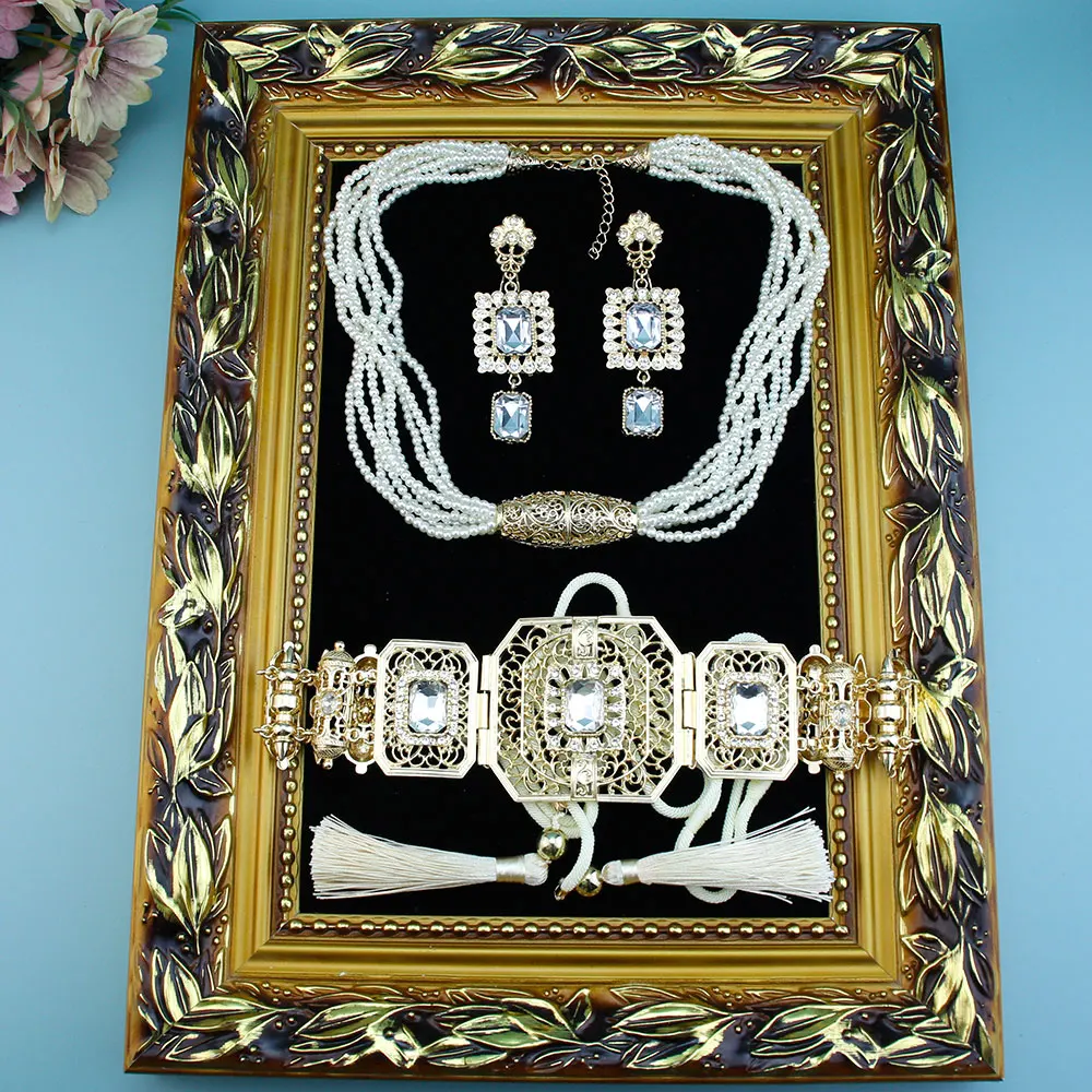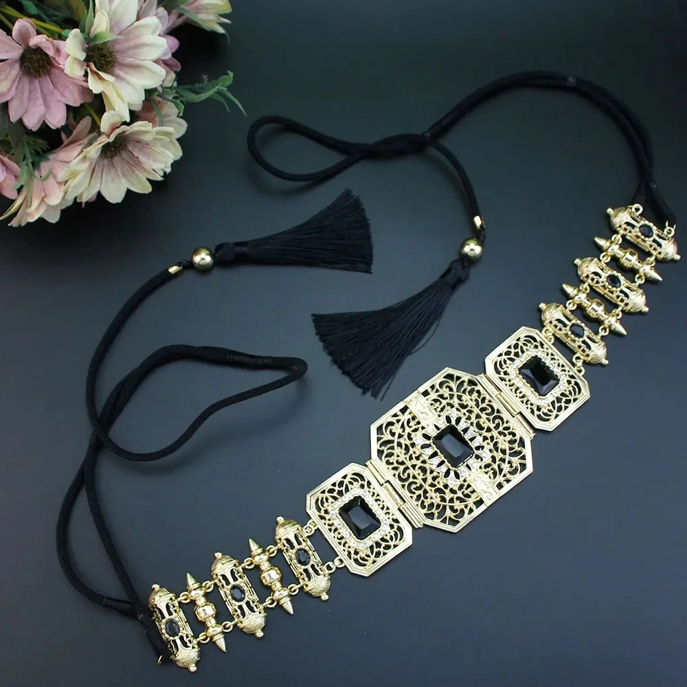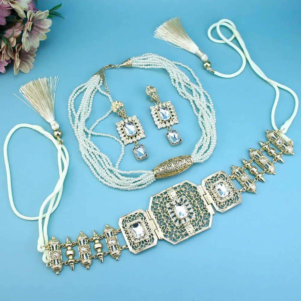 GZ Ice presents Trendy Arabic Caftan Belt Set: Rope, Tassels, Chain, Beads, Choker Necklace, Square Crystal Earrings