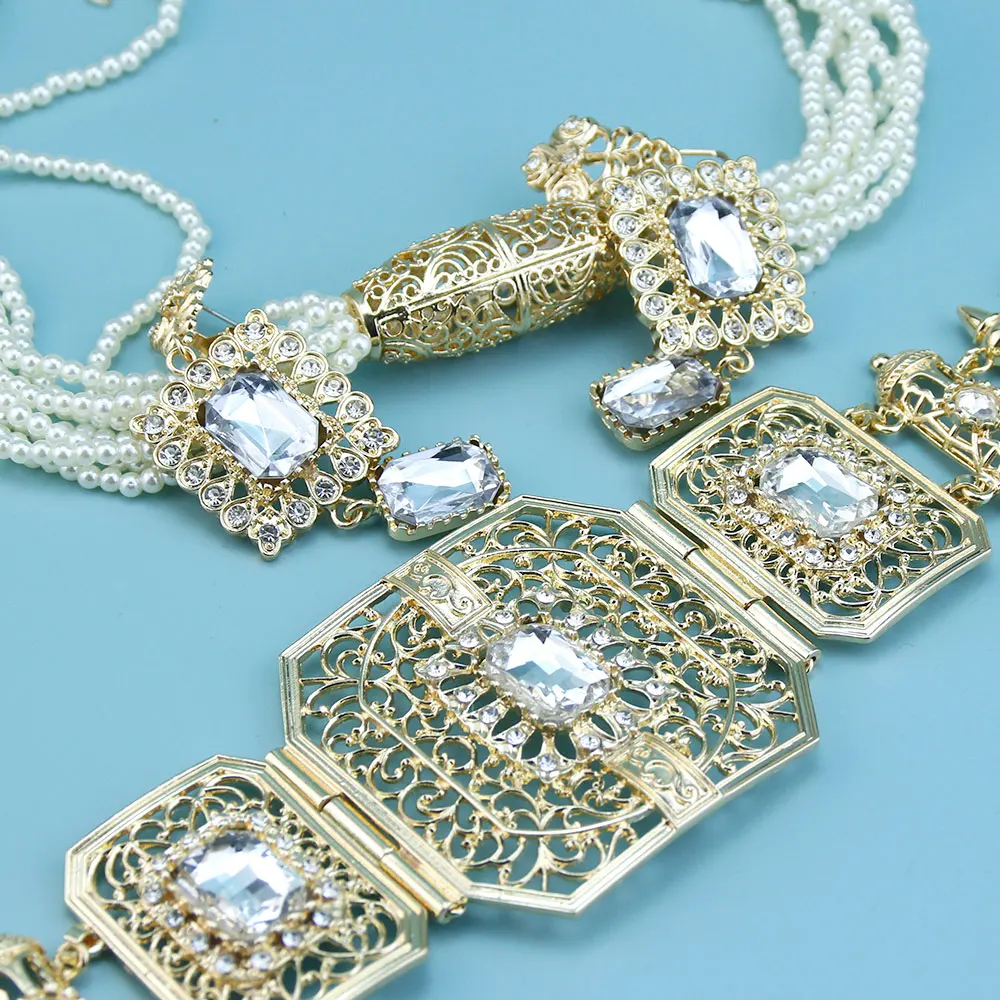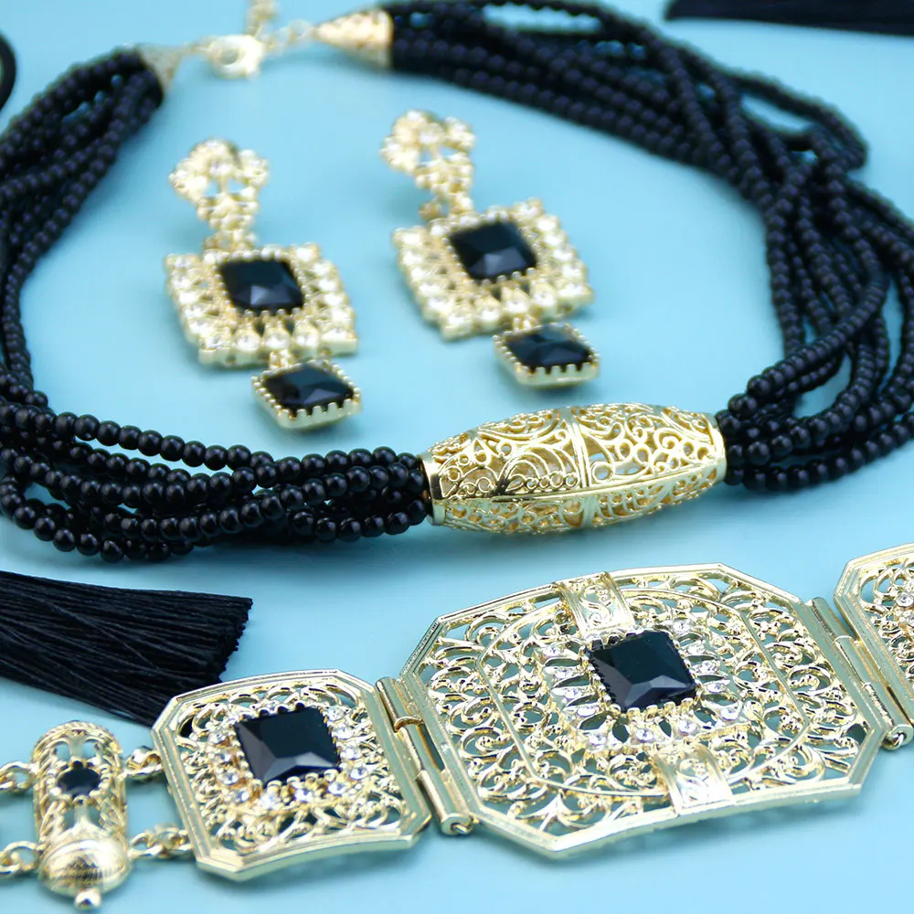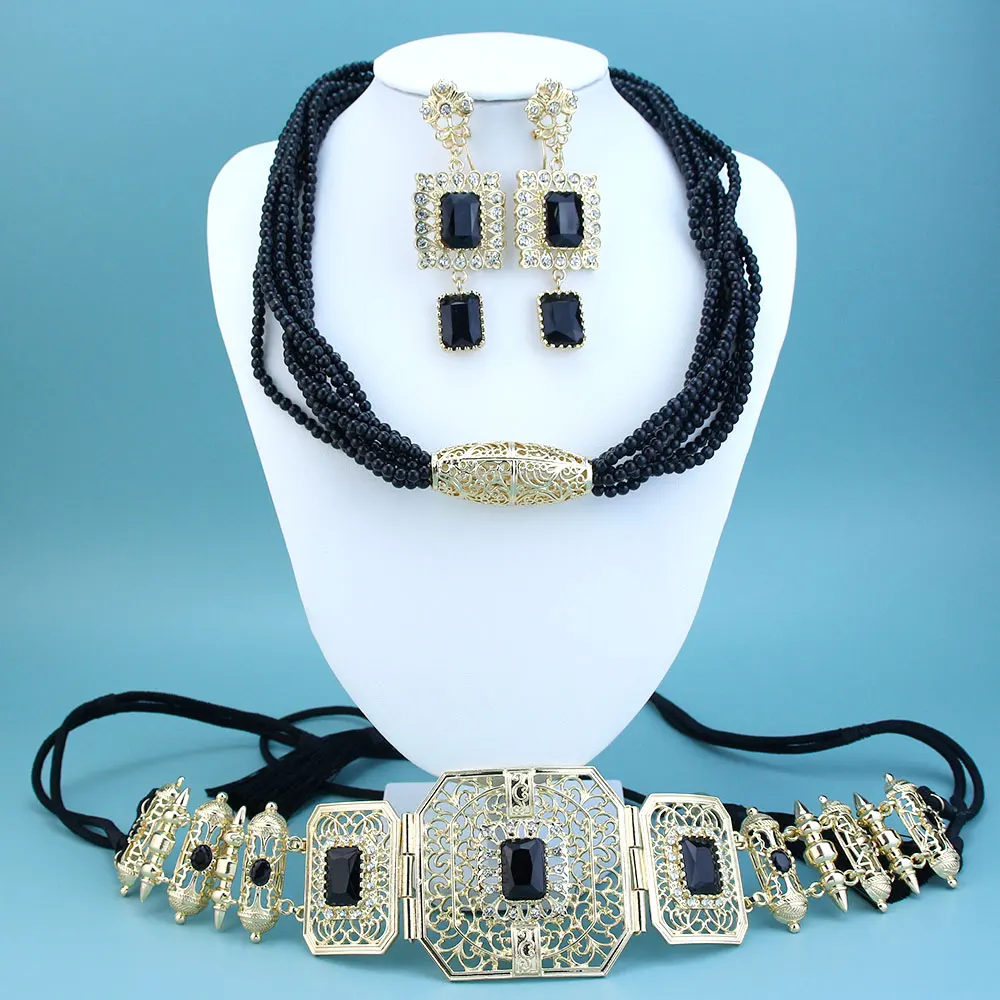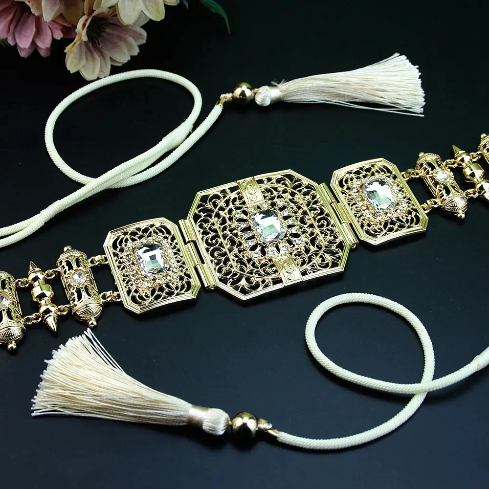 GZ Ice presents Trendy Arabic Caftan Belt Set: Rope, Tassels, Chain, Beads, Choker Necklace, Square Crystal Earrings